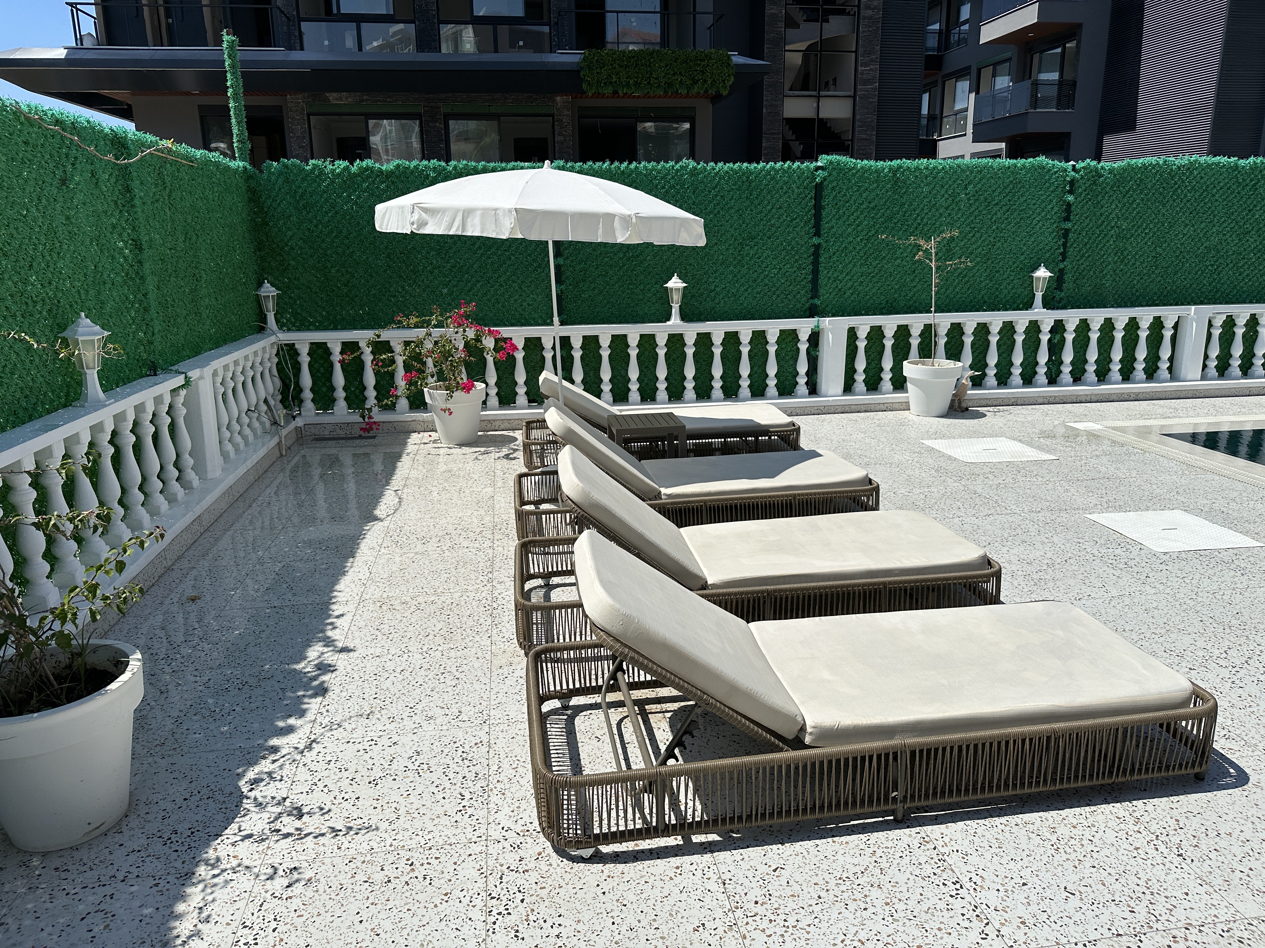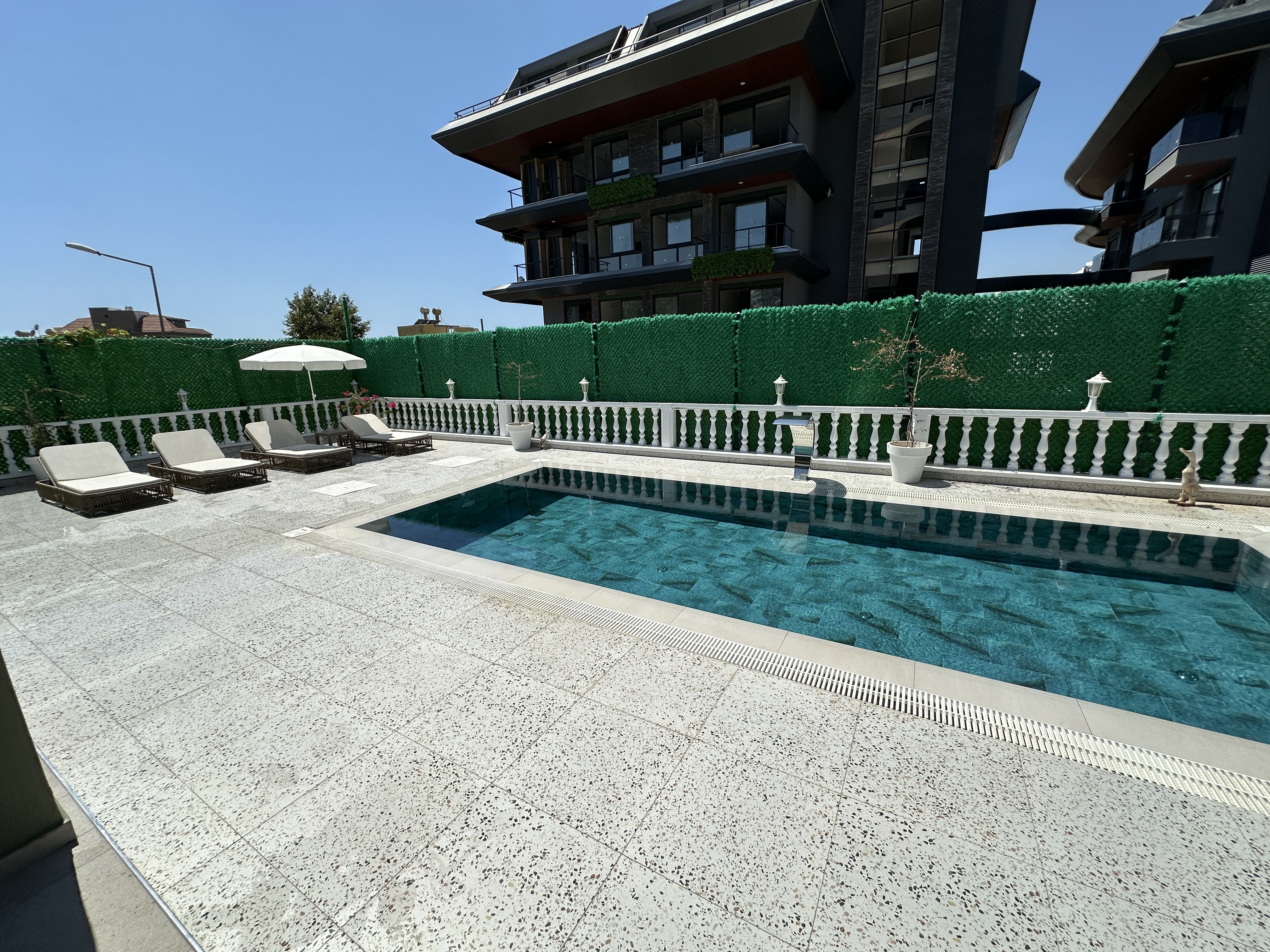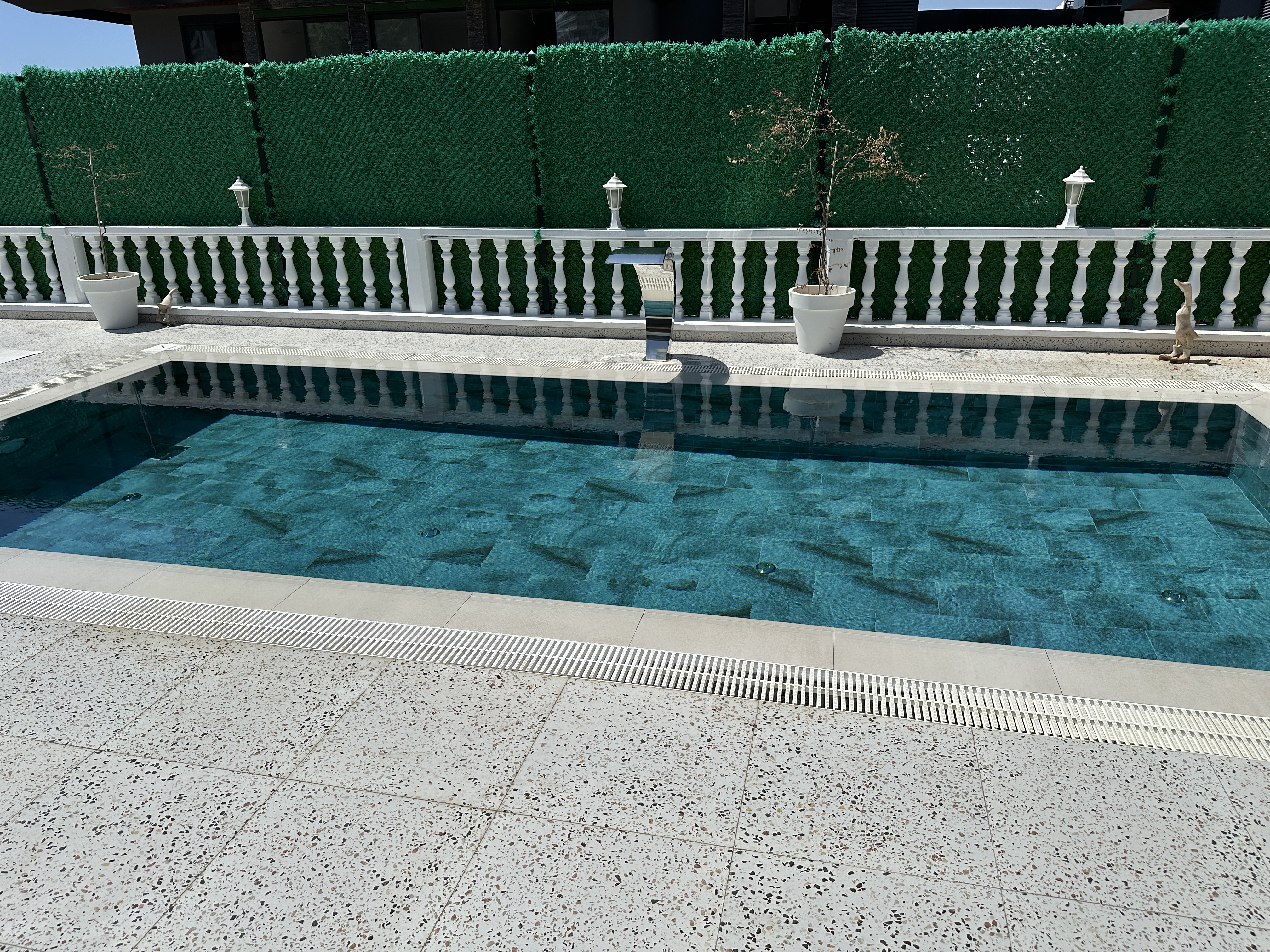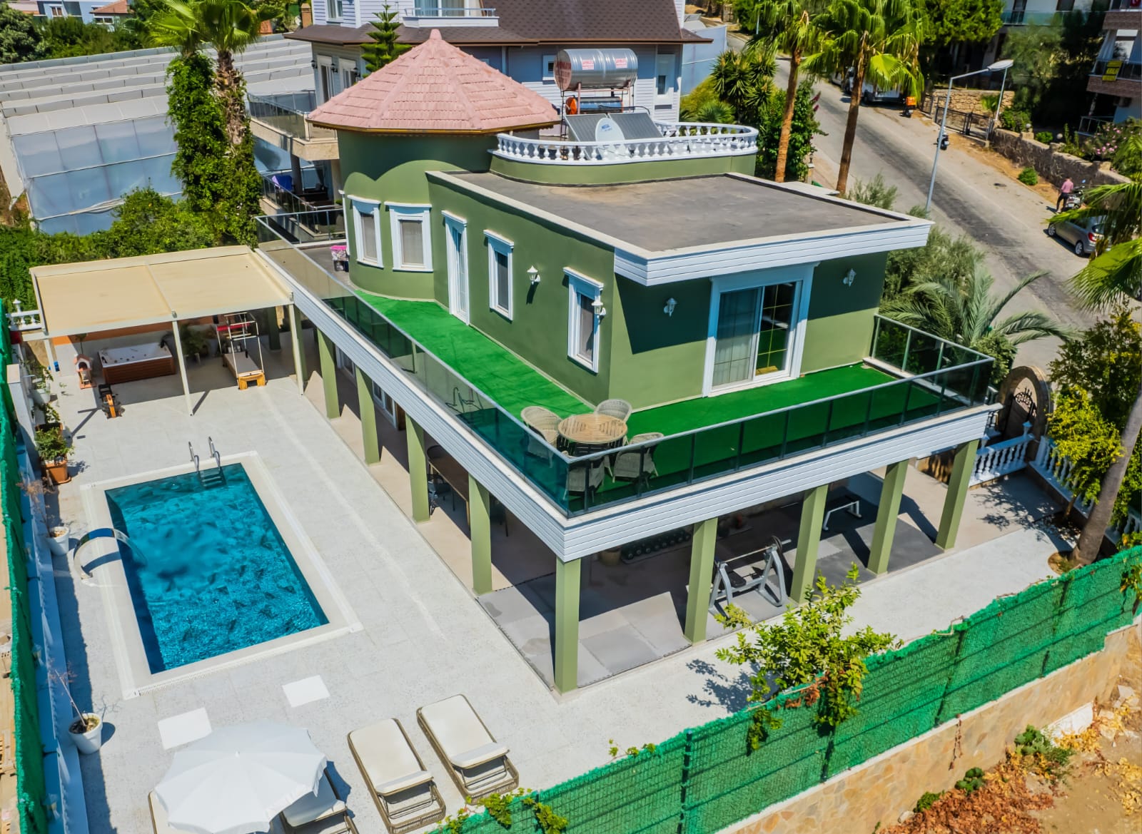 На участке есть хороший большой бассейн после реновации в 2024 году. Установлено джакузи и есть свой небольшой тренажерный центр. На крыше дома установлены конвекторы для нагрева воды. Есть большая терасса с искуственным покрытием.